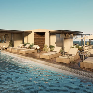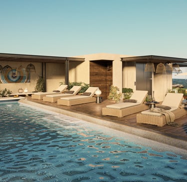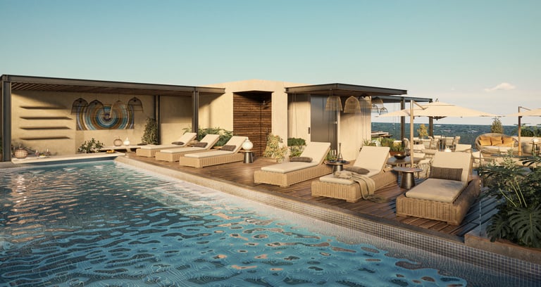 Rooftop with infinity pool, bars, grills, lounge, Balinese beds, sunbeds, and outdoor showers. Additional wellness features: fitness area, lounge zones, elevators, and smart home automation in units